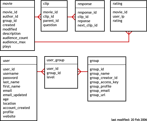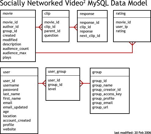 - (del) (rev) 07:11, 21 February 2006 . . Weters (Talk | contribs) . . 0×0 (29,142 bytes) (Socially Networked Video MySQL Data Model Last Modified: 20 Feb 2006)